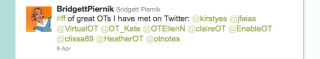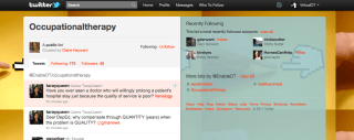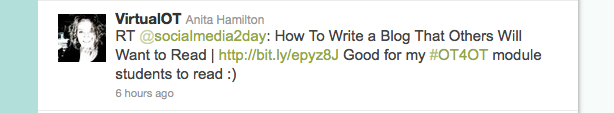 Tip 6. Use technology to organize your Tweets! The basic Twitter site will show you a constant feed of information from people you follow. However there will be people in the “Twitterspehere” posting about topics you are interested in. You need a way to collect and organize Tweets by topic. There are a number of Apps for phones and computers to help you organize tweets by topic. TweetDeck, HootSuite, and TweetCaster help you organize your Twitter account for your phone, desktop computer, iPad, laptop etc. It can be daunting to work out which App to use, I have settled with Tweetdeck and am happy with its performance. On my Tweetdeck I leave a search column open at all times for the terms #OT, #Virtual-World-OT-Day, #OccupationalTherapy, and #OT4OT. I also use these hashtags frequently when chatting with my OT Twitter friends.