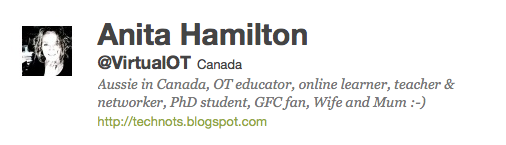 Yes, I agree, following too many people makes it quite overwhelming doesn't it! On another note: This last week I was part of a tweet-athon at the CAOT conference. I really enjoyed looking back at the tweets from the conference, they were an excellent summary of the key points (as I heard them) and I have already been reflecting on the key messages. Bonus is that this can also be used as evidence of CPD!Cheers, Anita